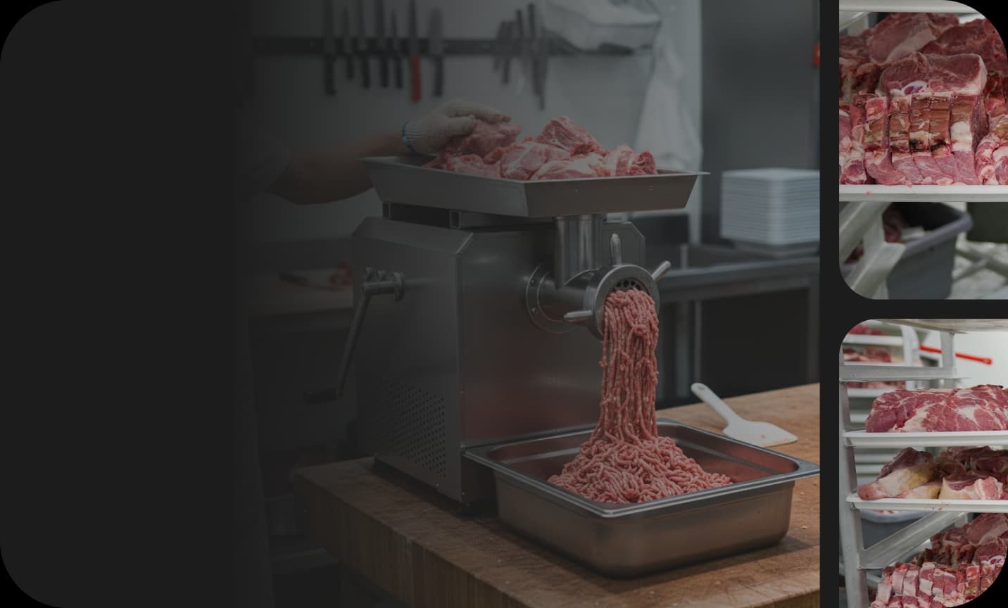 Industrial meat and poultry processing equipment for cutting, grinding, trimming and portioning