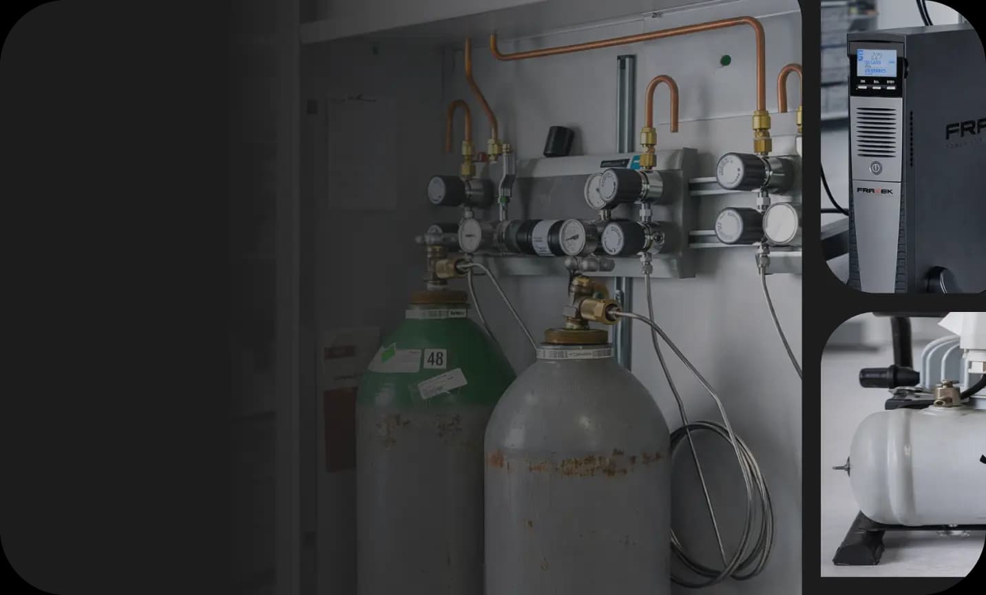 Laboratory utility systems including gas distribution panels, vacuum pumps, UPS units and pure water systems
