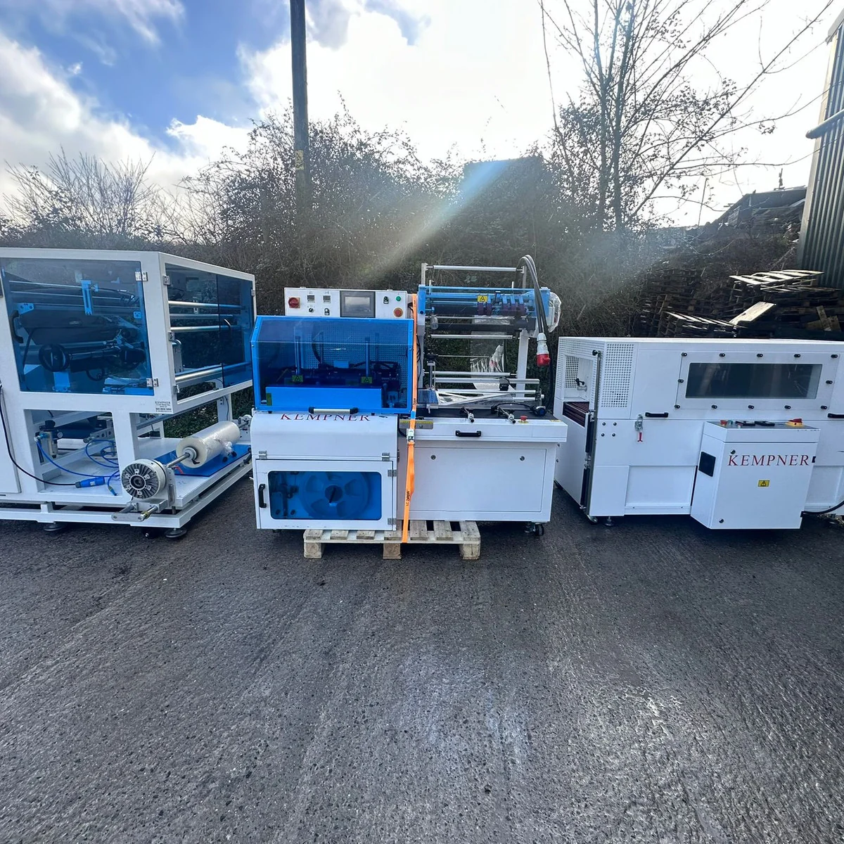 Complete Kempner automatic L-sealing, shrink wrapping and labelling system, manufactured in 2024 and in excellent working condition. This system comprises of the following machines: