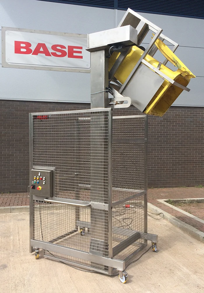BTM/300/2150/M/G Single Pillar 240 Litre Wheelie Bin TipperThis Single Pillar 240 Litre Wheelie Bin Tipper is designed to lift Britvic special bins and 240 Litre Wheelie Bins to tip at a discharge height of 2150mm. The 240 Litre Wheelie Bin Tipper is manufactured from Grade 304 stainless steel, is a welded construction throughout and is designed to be mobile on castors. The lifting is achieved by a ¾” Duplex chain driven by a motor gearbox mounted at the top of the main column. Safety Guard to BS EN 14120:2015 Safety of MachineryThe safety guard is constructed from 40 x 40 x 3mm stainless steel box section and 3mm wire, 40mm aperture stainless steel weld mesh to meet the guidelines of BS EN 14120:2015 Safety of Machinery. It encloses the 240 Litre Wheelie Bin Tipper to a height of 2200mm on three sides, with a hinged guard door on the fourth side. The guard door is electrically and mechanically interlocked preventing the 240 Litre Wheelie Bin Tipper from operating when the door is open. Additionally, the guard door can only be opened when the lift carriage is at the full down position to prevent access whilst a load is raised. 240 Litre Wheelie Bin Tipper Electrical ControlThis 240 Litre Wheelie Bin Tipper is fitted with an IP65 Stainless Steel Control Panel which is mounted on the main frame at a convenient position to give good maintenance access under the Provision and Use of Work Equipment Regulation 1998 (PUWER). The control panel incorporates the following controls; Up, Down, Guard Release, Emergency Stop and a Reset Facility. The 240 Litre Wheelie Bin Tipper operation is latched so that pressing the ‘Up’ push button once will raise the lift to the full tip position. Once the product has been discharged, pressing the ‘Down’ push button once will return the 240 Litre Wheelie Bin Tipper to the full down position. The control panel has the facility for a ‘call to run’ signal to be connected if required. |