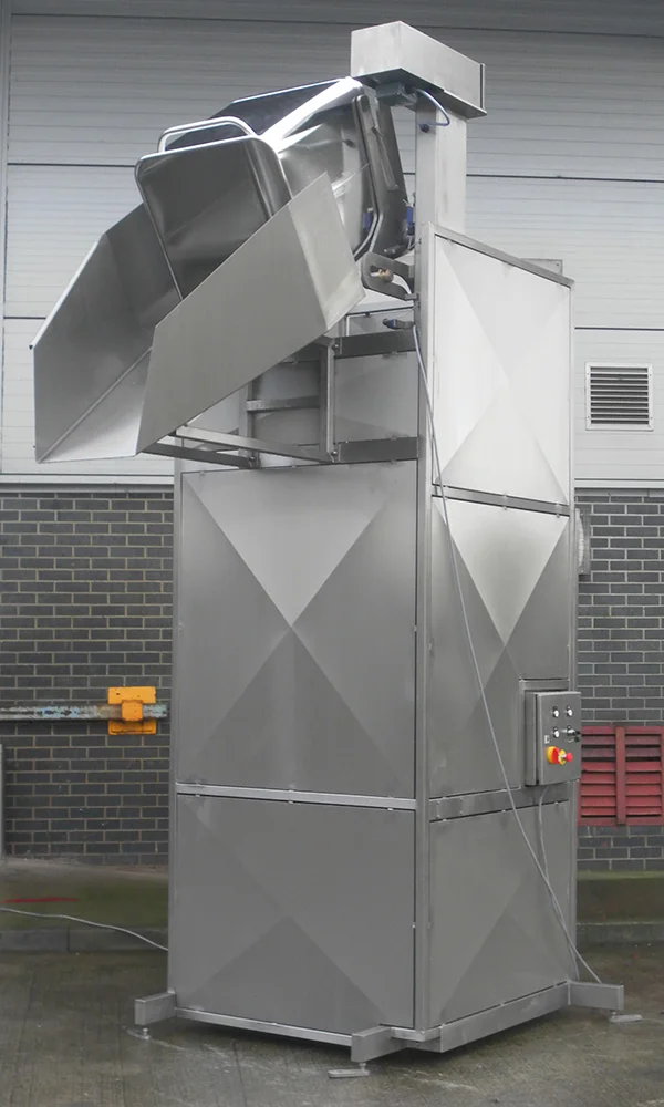 BTM/350/2850/B/G Single Pillar 300 Litre Bin TipperThis 300 Litre Bin Tipper is designed to lift and tip at a discharge height of 2850mm into an intermediate transfer chute that will feed into the top of a mixer. The 300 litre bin tipper is constructed from Grade 304 stainless steel, is fully TIG welded throughout and is designed to be mobile on castors. The lifting is achieved by a ¾” Duplex chain driven by a motor gearbox mounted at the top of the main column. Safety Guard to BS EN 14120:2015 Safety of Machinery GuardsThe safety guard is constructed from 40 x 40 x 3mm stainless steel box section and 2.0mm stainless steel sheet to meet the requirements of BS EN 14120:2015 Safety of Machinery Guards. It encloses the 300 Litre Bin Tipper to a height of 3200mm on all sides, approximately 2800mm on the tipping side with a hinged guard door on the fourth side. The guard door is electrically and mechanically interlocked preventing the 300 litre bin tipper from operating when the door is open. Additionally, the guard door can only be opened when the lift carriage is at the full down position to prevent access whilst a load is raised. 300 Litre Bin Tipper Electrical ControlThis 300 Litre Bin Tipper is fitted with an IP65 Stainless Steel Control Panel which is mounted on the main column at a convenient position to give good maintenance access under the Provision and Use of Work Equipment Regulation 1998 (PUWER). The control panel incorporates the following controls; Up, Down, Guard Release, Emergency Stop and a Reset Facility. There will be a remote push button station at the upper level with the following controls; Up, Down and Emergency Stop. The lift will rise automatically to an intermediate limit switch where control will transfer to the upper pushbutton station which will operate on a ‘dead man’s handle’ basis. The control panel has the facility for a ‘call to run’ signal to be connected if required. |
