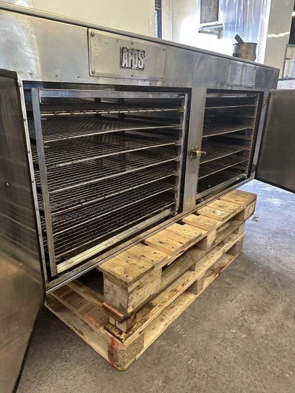 Feature: Smoking Kiln Make: Afos Model: Maxi Feature: Double Trolley, approx 50kg per cycle Feature: Hot and cold smoke, 7.25kw Feature: Unit will be supplied with new control panel with digital timer/temp controller Feature: Full details on request