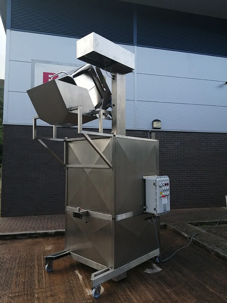BTM/300/2500/M Single Pillar ATEX Bin TipperThe ATEX Bin Tipper was designed to lift and tip at a discharge of 2500mm giving an overall height of approximately 3548mm. The wetted herb material would be tipped into an intermediate hopper that will ensure that there is no spillage during the tipping process. The ATEX Bin Tipper is manufactured from Grade 304 stainless steel, is a welded construction throughout and is designed to be mobile on two fixed and two swivel braked castors. The ATEX classification for the area in which this lift was installed was ATEX Zone 1 T2 IIB. All components and materials used and the design of the lift conformed to the requirements of this ATEX Classification. For this ATEX area classification, the ATEX Bin Tipper was independently evaluated for conformance to the relevant ATEX standards. ATEX Bin Tipper Electrical ControlThis ATEX Bin Tipper is fitted with an IP65 ATEX Control Panel which is mounted on the main column at a convenient position to give good maintenance access under the Provision and Use of Work Equipment Regulation 1998 (PUWER). The unguarded ATEX Bin Tipper has ‘dead man’s handle’ control such that the ‘Up’ or ‘Down’ pushbuttons must be held for the ATEX Bin Tipper to operate. As soon as the button is released, the ATEX Bin Tipper will stop. The control panel has the facility for a ‘Call to Run’ signal to be connected if required. |