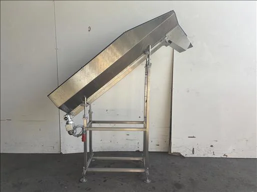 Aylesbury Automation flighted elevator conveyor, Stainless, elevates from 900mm to 1900mm, belt width 300mm, completely enclosed with side guides, overall length 2000mm, 3Ph