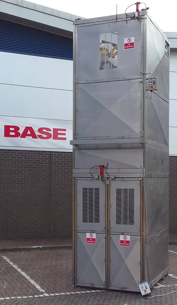 PLM/2P/1500/2850/B/G Double Pillar Between Floor LiftThis Double Pillar Between Floor Lift has a Safe Working Load of 1500 Kgs and a lift height of 2850mm. The lifting platform was big enough to allow a standard pallet (1200 x 1000mm) to be loaded using a hand pallet truck. At the upper level, there was a landing plate to allow easy unloading. The Between Floor Lift was manufactured from mild steel with a powder coated finish and is a welded construction throughout. The Between Floor Lift was designed to be bolted to the floor without the need for a pit. The lifting is accomplished via chains driven by a motor gearbox mounted at the top of the one column with a crossover shaft to the other column. To suit the plant layout, the pallets were loaded and unloaded from the same side of the lift at the lower and upper levels. To fit within the space available at the end of the mezzanine floor, the main columns of the Between Floor Lift were mounted at the rear of the between floor lift on the opposite side to the loading doors. The Between Floor Lift was made in two sections which were assembled on site during installation. There was ramp fitted at the ground floor and a landing plate and ramp on the mezzanine floor level. Safety Guard to BS EN 14120:2015 Safety of Machinery GuardsThe safety guard is constructed from 40 x 40 x 3mm box section and 2mm sheet to meet the guidelines of BS EN 14120:2015 Safety of Machinery Guards. This guard will reach to a height of 2200mm above the upper floor level, having a pair of hinged doors at each level through which the Between Floor Lift can be loaded and unloaded. Each door is electrically interlocked to prevent the between floor lift being operated with a door open and in addition, the doors are mechanically locked closed whilst the between floor lift is running. Each door may only be opened when the lifting carriage is at the appropriate level. The guard doors can be meshed with 25 x 25mm mesh if preferred at no additional cost. Between Floor Lift Electrical ControlThis Between Floor Lift is fitted with an IP65 Stainless Steel Control Panel which is mounted on the safety guard at a convenient position to give good maintenance access under the Provision and Use of Work Equipment Regulation 1998 (PUWER). The control panel incorporates the following controls; Up, Down, Guard Release, Emergency Stop, Cleaning Key Switch and a Reset Facility. There will be a remote push button station at the upper level incorporating the following controls; Up, Down, Guard Release and Emergency Stop. The between floor lift operation is latched so that pressing the respective ‘Up’ or ‘Down’ push buttons once will raise or lower the lift to the other floor level. Each time the Lift Carriage activates the upper limit switch, an electrical actuator will be driven out underneath the lift carriage to support it while it is loaded. Before the lift can move again, the actuator will retract automatically once the down button is pressed. Between Floor Lift Cleaning SystemThis cleaning system will be fitted to your Between Floor Lift during manufacture to allow access to the floor beneath the lift carriage for cleaning. The cleaning system will operate as follows:-