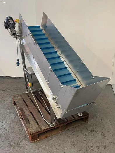 Used Blue Incline Conveyor. Single Phase Power with Adjustable Speed.