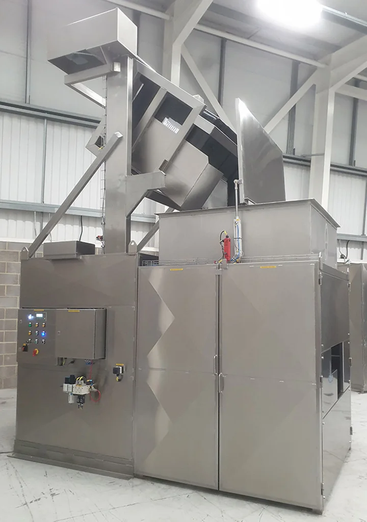 BTM/2P/300/2800/B/G Double Pillar Box DumperThis Double Pillar Box Dumper was designed to lift and tip a Pallet Box (1200mm L x 1000mm W x 1200mm H) weighing 180 Kgs to load the contents into a storage hopper at a discharge height of 2800mm. The storage hopper was sized to have a volume equal to 200% of the volume of the Pallet Box. The Box Dumper was manufactured from Grade 304 Stainless Steel, was a welded construction throughout and was designed to be bolted to the floor. The lifting was accomplished via chains driven by a motor gearbox mounted at the top of the one column with a crossover shaft to the other column. Storage HopperThe Storage Hopper was constructed from 304 Stainless Steel Box Section and 3mm sheet and had a volume of 200% the volume of the Pallet Box. The Storage Hopper was fitted with a lid to protect the product from contamination once it was discharged. The lid was only opened when a box was tipped and was controlled by a level sensor inside the hopper. Safety Guard to BS EN 14120:2015 Safety of Machinery GuardsThis Box Dumper was supplied complete with a safety guard to meet the guidelines of BS EN 14120:2015 Safety of Machinery Guards. The safety guard is constructed from 40 x 40 x 3mm stainless steel box section and 2.0mm stainless steel sheet. The safety guard encloses the Box Dumper to a height of 2200mm on all sides, with a pair of hinged guard doors on one side for loading the Pallet Box. The guard doors are electrically and mechanically interlocked preventing the Box Dumper from operating when a door is open. Additionally, the guard doors can only be opened when the lift carriage is at the full down position to prevent access whilst a load is raised. Box Dumper Tipper Electrical ControlThis Box Dumper was fitted with an IP65 Stainless Steel Control Panel mounted on the Safety Guard at a convenient position to give good maintenance access under the Provision and Use of Work Equipment Regulation 1998 (PUWER). The control panel incorporates the following controls; Up, Down, Guard Release, Emergency Stop and a Reset Facility. Dual Upper and Lower end of travel limit switches were positioned to prevent inadvertent adjustment or damage but were easily adjustable by trained personnel for fine adjustment on site. The guarded Box Dumper operation was latched so that pressing the ‘Up’ push button once raised the lift until it reached the Full Up limit switch, where it stopped. Once all product was discharged, pressing the ‘Full Down’ push button lowered the lift under latched control until it reached the lower end of travel limits. Box Dumper Cleaning & Safe Access SystemThis Cleaning & Safe Access System was fitted to the Box Dumper during manufacture to allow safe access to the inside of the safety guard at the lower level for cleaning and maintenance. The Cleaning & Safe Access System operated as follows:-