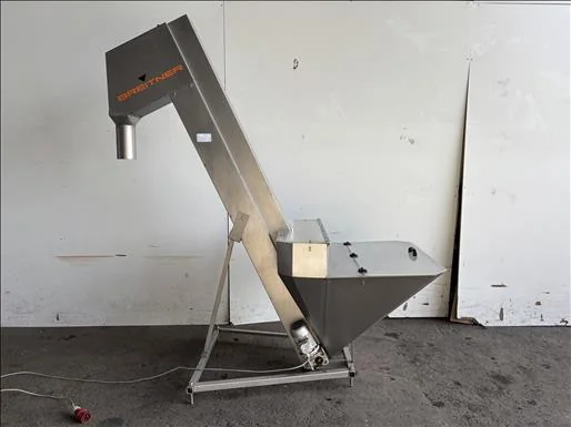 Breitner flighted elevator conveyor Stainless, 100Kg hopper, elevates from 300mm to 1800mm, belt width 150mm, overall length 2100mm 3Ph