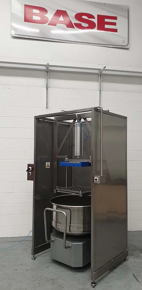 PBC/400 x 300/B/Mixing Bowl Butter CutterThis Butter Cutter is designed to cut tempered blocks of butter into 75 x 75mm segments. To cut the butter into individual blocks they can be turned through 90 degrees and placed back onto the cutting frame for a second cut. The Butter Cutter is manufactured from Grade 304 Stainless Steel throughout and the cutting operation is via a guided pneumatic cylinder and pusher plate. When the cylinder extends it presses the butter through the cutting blades and into a mixing bowl placed underneath. The Butter Cutter is enclosed in a stainless sheet metal design on both sides and the back with the front open to allow the butter blocks to be loaded and unloaded. Control of the cutting operation is via dual pneumatic push button control mounted either side of the opening at the front. The cut and retract operations are selected via a selector switch and then both push buttons must be held to operate the Butter Cutter on a hold to run principle. All parts of the Butter Cutter and components such as the pushing block and the cutting frame are easily removable for cleaning purposes. The Butter Cutter is mounted on stainless steel rubber based adjustable feet which can be used to level the Butter Cutter once in position. Frequently Asked QuestionsWhat is the range of temperatures that the cutter will accept?Basically the colder the block of butter, the longer it will take to cut and if it is still frozen, it will not cut until it has thawed. We cannot be specific about how long this might take because there are too many variables involved, such as the starting temperature of the block, the block size, the ambient temperature etc. When a 400 x 300 x 300mm Butter Block has reached a temperature of over 5° Celsius, at its core, the block takes approximately 15 seconds to cut. It should be noted that if a frozen block is loaded to the machine, damage to the machine is possible. How many blocks per hour will the Butter Cutter handle?If it is assumed that we are using a similar block size at a similar temperature and estimate an unwrapping and loading time of 45 seconds, then the throughput would be around 60 blocks per hour. What are the cut sizes achieved by the cutter?The normal cutting frame aperture size is 75 x 75mm although this can be adjusted, at the time of manufacturer to suit specific requirements. The 75 x 75mm cut increases the surface area of the Butter Block by almost 3 times once cut. What is the air consumption per cut?Approximately 80 Litres/Minute. |