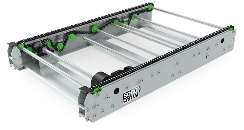Specifications Payload For use up to 1,500 kg load per pallet and motor unit. Maximum suitable load is determined by several factors like speed of operation, width of conveyor, and shape and width of the pallets. If in doubt, please contact SOCO SYSTEM. Standard height Supports available for standard heights from 225 mm to 650 mm. Other heights available on request. Chains 3/4' pallet chain with straight side plates. Chain distance Approx. 700 mm for 750 mm width. Approx. 900 mm for 950 mm width. Gear motor 0.55 kW. Worm reduction gear mounted on cross bar between the frames. Speed 11.8 m/min., 1500 kg with single gear motor. Other speeds available on request. Subject to alteration.