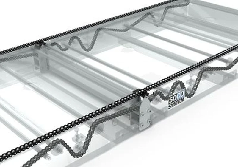 Specifications Payload For use up to 1,500 kg load per pallet and motor unit. Maximum suitable load is determined by several factors like speed of operation, width of conveyor, and shape and width of the pallets. If in doubt, please contact SOCO SYSTEM. Standard height Supports available for standard heights from 225 mm to 650 mm. Other heights available on request. Chains 3/4' pallet chain with straight side plates. Chain distance Approx. 700 mm for 750 mm width. Approx. 900 mm for 950 mm width. Subject to alteration.