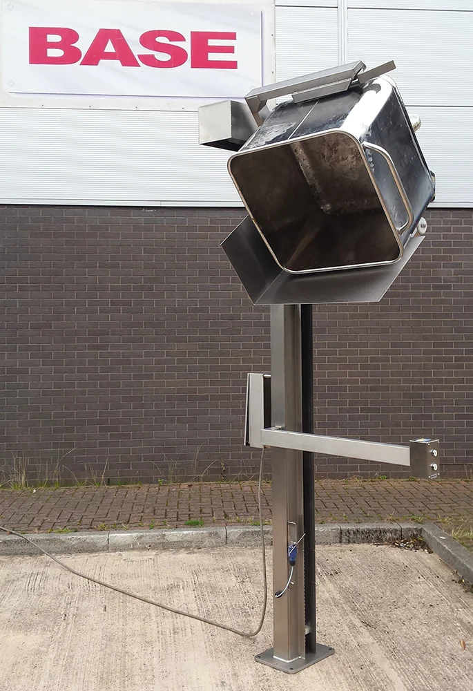 BTM/250/1850/B/SL Single Column Bin HoistThis Single Column Bin Hoist is a 200 Litre tote bin tipper with a side loading lift carriage that is designed to lift and tip at a discharge height of 1850mm. The Column Bin Hoist is manufactured from Grade 304 stainless steel, is a welded construction throughout and is designed to be bolted to the floor. The lifting is achieved by a ¾” Simplex chain driven by a motor gearbox mounted at the top of the main column. The unguarded Column Bin Hoist is fitted with our unique safety latch which engages automatically in the extremely unlikely event of a lift chain failure. Column Bin Hoist Electrical ControlThis Column Bin Hoist is fitted with an IP65 Stainless Steel Control Panel which is mounted on the main column at a convenient position to give good maintenance access under the Provision and Use of Work Equipment Regulation 1998 (PUWER). Upper and Lower end of travel limit switches are positioned to prevent inadvertent adjustment or damage but are easily adjustable by trained personnel for fine adjustment on site. The unguarded Column Bin Hoist operates on a ‘hold to run’ principle such that the ‘Up’ or ‘Down’ pushbuttons must be held for the Column Bin Hoist to operate. As soon as either button is released, the Column Bin Hoist will stop. The control panel has a volt free pair of contacts which can be used to connect a ‘Call to Run’ signal if required. |