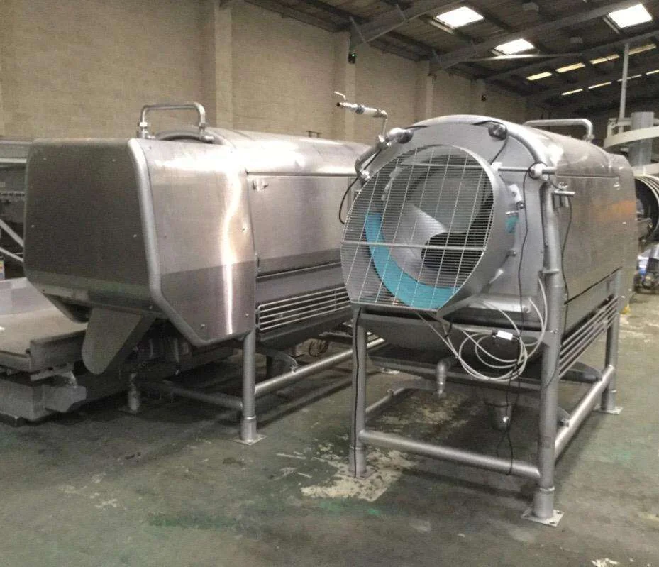 They work by rapidly spinning potatoes with water in a large abrasive-lined drum