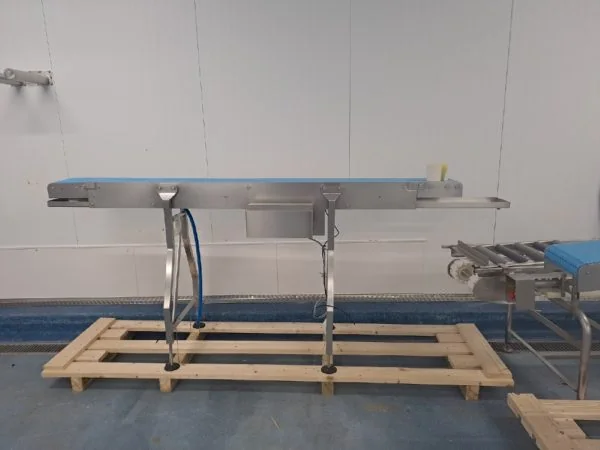 Feature: Conveyor Feature: Blue Plastic belt Feature: 250mm belt width Feature: 2.7m long (approx) Feature: Stainless steel Frame Feature: Belt in Excellent Feature: Adjustable feet, current infeed at 1.2m