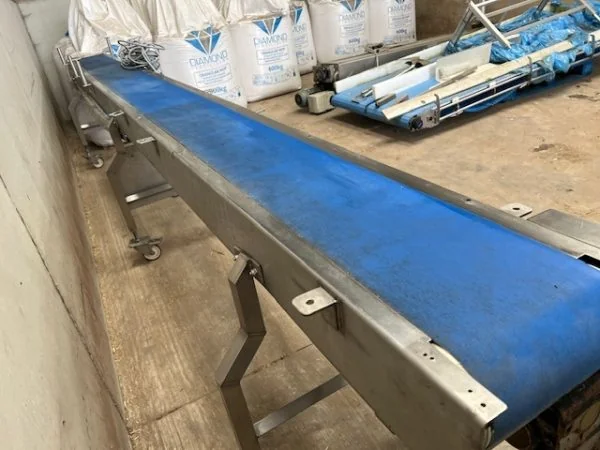 Feature: Conveyor Feature: 4.5m Long x 240mm belt width Feature: Plastic PU Belt Feature: Stainless frame Feature: Mobile, on wheels Make: Phoenix (UK)