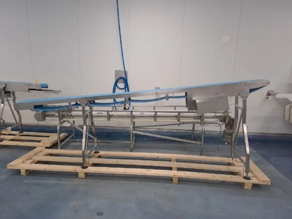 Feature: Conveyor Feature: Inclined Feature: 245cm belt width Feature: 3.8m long Feature: Plastic belt, Excellent condition Feature: Stainless frame, adjustable feet Feature: Infeed currently set at 95cm Feature: Outfeed currently set at 136cm
