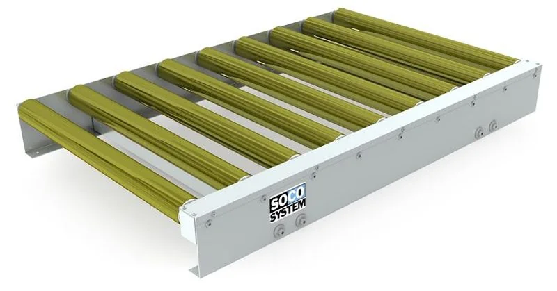 Specifications Surface treatment Electro galvanized steel with the exception of chain and roller axles. Rollers are electro galvanized with yellow crome. Frames Cold-bend angle profiles bolted to C-profile cross bars with supports. Rollers ? 80 mm electro galvanized steel tubes. Axle diameter ? 17 mm. Bearings rs. Roller fittings Rollers are suspended between side frames by means of M10 axle. Payload For use up to 1,500 kg load per pallet and motor unit. Maximum suitable load is determined by several factors like speed of operation, width of conveyor, and shape and width of the pallets. If in doubt, please contact SOCO SYSTEM. Standard height The total height from floor to top of rollers is 90 mm. Chain drive Chains operate beneath roller surface. Chain drive is from roller to roller. ?' sprockets of hardened steel are integrated with the bearing of the roller. Chain cover Chains are protected by a U-profile mounted above the chains. The chain cover is beneath the roller level to ensure access to pallets from both sides of the conveyor. Subject to alteration.