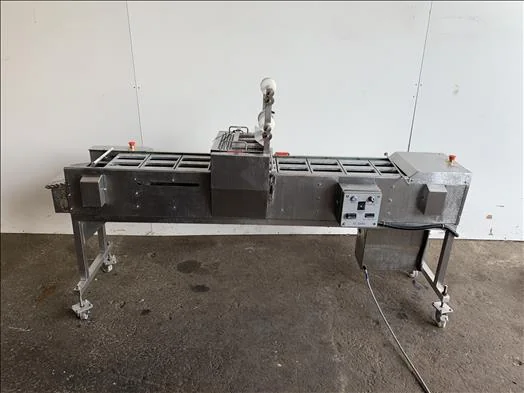 Stainless, ideal for sealing sandwich wedges of all sizes into plastic trays, up to 60 products per min, variable speed, adjustable temp controls, currently set for 165mm x 66mm skillet, 2200mm overall length, mobile, 1Ph