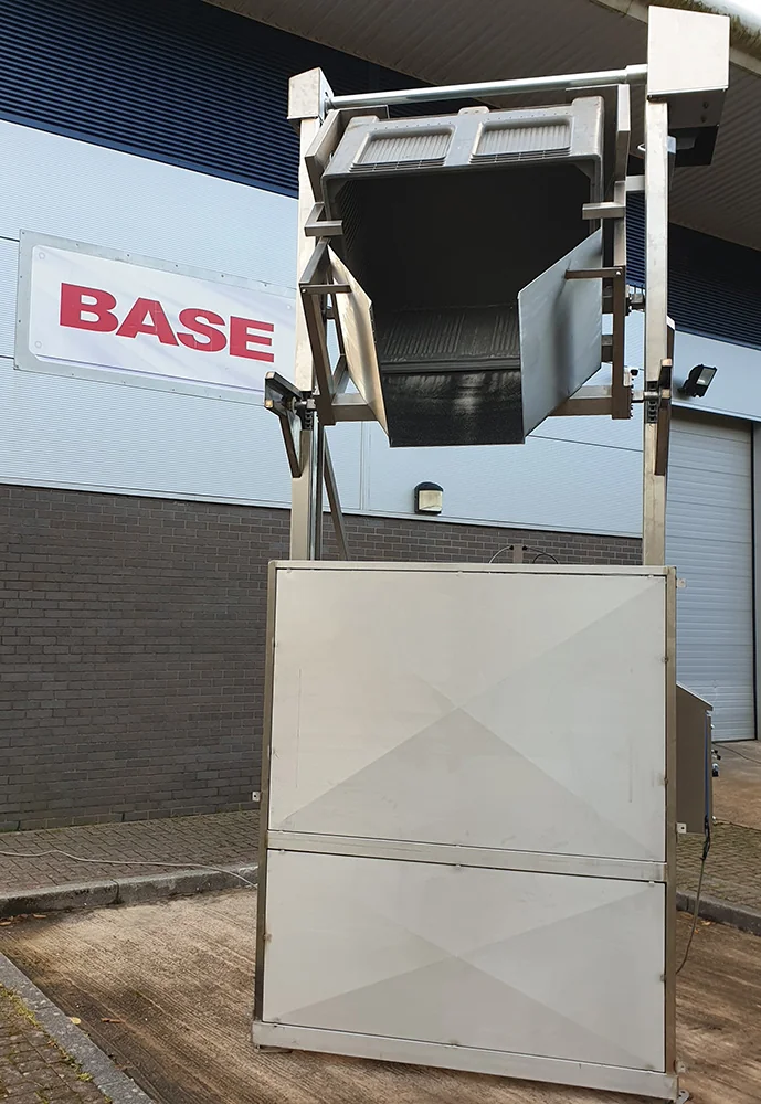 BTM/2P/400/2800/B/G Double Pillar Dolaf Box TipperThis Double Pillar Dolaf Box Tipper is designed to lift and tip a Magnum 1208 Pallet Box (1200mm L x 800mm W x 950mm H) at a discharge height of 2800mm into a Transfer Chute feeding the product into a Storeveyor. The box wa loaded and tipped over the wide side. The Dolaf Box Tipper is manufactured from Grade 304 stainless steel, is a welded construction throughout and is designed to be bolted to the floor. The lifting is accomplished via chains driven by a motor gearbox mounted at the top of the one column with a crossover shaft to the other column. Safety Guard to BS EN 14120:2015 Safety of Machinery GuardsThis Dolaf Box Tipper was supplied complete with a safety guard to meet the guidelines of BS EN 14120:2015 Safety of Machinery Guards. The safety guard is constructed from 40 x 40 x 3mm stainless steel box section and 2.0mm stainless steel sheet. The safety guard encloses the Dolaf Box Tipper to a height of 2200mm on all sides with a pair of hinged guard doors through which the bin is loaded. The upper sections of the safety guarding was fitted with laser cut panels and the lower sections had solid panels. There was a further section of safety guarding around the far side of the Transfer Chute also with an interlocked safety gate which was released via a ‘Guard Release’ Push Button on the Main Control Panel to allow access for Maintenance and/or Cleaning. All guard doors are electrically and mechanically interlocked preventing the Dolaf Box Tipper from operating when a door is open. Additionally, the guard doors can only be opened when the lift carriage is at the full down position to prevent access whilst a load is raised. Where possible horizontal members were turned through 45° to minimise the number of ledges in the design and the Motor and Bearing Covers were designed with sloping roofs. Dolaf Box Tipper Electrical ControlThis Dolaf Box Tipper is fitted with an IP65 Stainless Steel Control Panel which is mounted on the Safety Guard at a convenient position to give good maintenance access under the Provision and Use of Work Equipment Regulation 1998 (PUWER). The control panel incorporates the following controls; Control On, System Start, Guard Release, Emergency Stop and a Reset Facility and will be a sloping roof enclosure. Dual Upper and Lower end of travel limit switches are positioned to prevent inadvertent adjustment or damage but are easily adjustable by trained personnel for fine adjustment on site. The Dolaf Box Tipper operation is latched so that pressing the ‘System Start’ push button once will raise the lift to an intermediate limit switch position. From this point, the tipping action will be controlled by the Siemens PLC and the customers Storeveyor Photo Cell which was connected to a volt free pair of contacts and used as a ‘Call to Run’ signal. As long as the ‘Call to Run’ signal was being received, the tipper would run and then pause, gradually discharging product until its reached the Full Up position. Once the Dolaf Box Tipper reached the Full Up position and all product had been discharged, it automatically returned to the ‘Full Down’ position. |