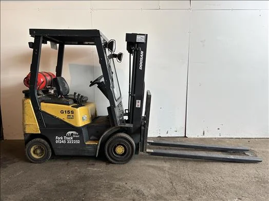 Doosan G15S-2 Forklift truck Serial: DG01041 Runs on LP GAS, up to 1500Kgs lift capacity, max lift height 4730mm, treble masts, tilt forwards and backwards, with sideshift, comes with fork extensions