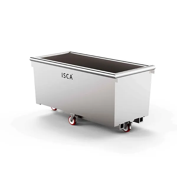 A stainless steel fully welded metal dough trough, mobile on castor wheels, with a drain hole and lifting lugs built in as standard.