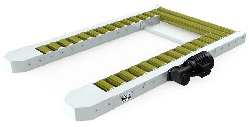 Specifications Surface treatment Electro galvanized steel with the exception of gear motor, chain, and roller axles. Rollers are electro galvanized with yellow crome. Frames Cold-bend angle profiles bolted to C-profile cross bars with supports. Rollers ? 80 mm electro galvanized steel tubes. Axle diameter ? 17 mm. Bearings rs. Roller fittings Rollers are suspended between side frames by means of M10 axle. Payload For use up to 1,500 kg load per pallet and motor unit. Maximum suitable load is determined by several factors like speed of operation, width of conveyor, and shape and width of the pallets. If in doubt, please contact SOCO SYSTEM. Standard height The total height from floor to top of rollers is 90 mm. Chain drive Chains operate beneath roller surface. Chain drive is from roller to roller. ?' sprockets of hardened steel are integrated with the bearing of the roller. Chain cover Chains are protected by a U-profile mounted above the chains. The chain cover is beneath the roller level to ensure access to pallets from both sides of the conveyor. Gear motor 0.37 kW. Worm reduction gear sidemounted on conveyor frame. Speed 11.4 m/min. (other speeds available). Subject to alteration. Customer service General terms of sale and delivery General delivery times Genera