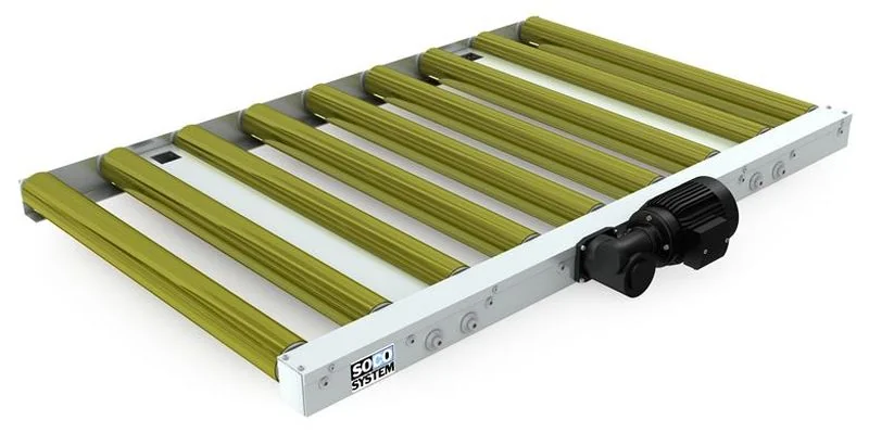 Specifications Surface treatment Electro galvanized steel with the exception of gear motor, chains, and roller axles. Rollers are electro galvanized with yellow crome. Frames Cold-bend angle profiles bolted to C-profile cross bars with supports. Rollers ? 80 mm electro galvanized steel tubes. Axle diameter ? 17 mm. Bearings rs. Roller fittings Rollers are suspended between side frames by means of M10 axle. Payload For use up to 1,500 kg load per pallet and motor unit. Maximum suitable load is determined by several factors like speed of operation, width of conveyor, and shape and width of the pallets. If in doubt, please contact SOCO SYSTEM. Standard height The total height from floor to top of rollers is 190 mm. Chain drive Chains operate beneath roller surface. Chain drive is from roller to roller. 1/2' sprockets of hardened steel are integrated with the bearing of the roller. Chain cover Chains are protected by a U-profile mounted above the chains. The chain cover is beneath the roller level to ensure access to pallets from both sides of the conveyor. Gear motor 0.37 kW. Hollow shaft worm reduction gear sidemounted on conveyor frame. Speed 11.4 m/min (other speeds available). Subject to alteration.