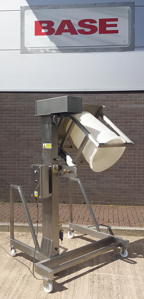 BTM/250/1275/M Single Pillar Drum HoistThis Mobile Single Pillar Drum Hoist is designed to lift and tip at a discharge height of 1275mm. The Drum Hoist is manufactured from Grade 304 stainless steel and is a welded construction throughout. The lifting is achieved by a ¾” Simplex chain driven by a motor gearbox mounted at the top of the main column. The Drum Hoist is fitted with our unique safety latch which engages automatically in the extremely unlikely event of a lift chain failure. To avoid spillage as your drums are being tipped, we feel that there should be a conical intermittent infeed cone which will locate into the Sieve Inlet and allow the ingredients to pass through without spillage. Drum Hoist Electrical ControlThis Drum Hoist is fitted with an IP65 Stainless Steel Control Panel which is mounted on the main column at a convenient position to give good maintenance access under the Provision and Use of Work Equipment Regulation 1998 (PUWER). The Drum Hoist has ‘dead man’s handle’ control such that the ‘Up’ or ‘Down’ pushbuttons must be held for the Drum Hoist to operate. As soon as the button is released, the Drum Hoist will stop. The control panel has the facility for a ‘Call to Run’ signal to be connected if required. |