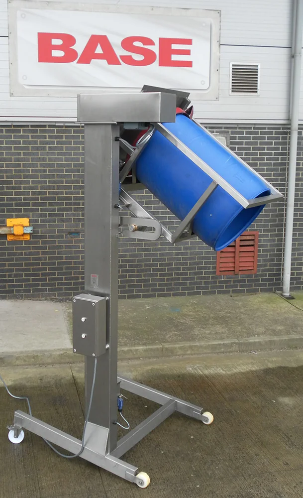 BTM/250/1600/M Single Pillar Drum TipperThis Single Pillar 200 Litre Drum Tipper that is designed to lift and tip at a discharge height of 1600mm. The Drum Tipper is constructed from Grade 304 stainless steel, is fully welded throughout and is designed to be mobile on castors. The lifting is achieved by a ¾” Simplex chain driven by a motor gearbox mounted at the top of the main column. The Drum Tipper is fitted with our unique safety latch which engages automatically in the extremely unlikely event of a lift chain failure. To load the drum into the tipper, the operator wheels the drum and trolley onto the lift carriage. The drum will be securely retained in the lift carriage in the tipped position. Drum Tipper Electrical ControlThis Drum Tipper is fitted with an IP65 Stainless Steel Control Panel which is mounted on the main column at a convenient position to give good maintenance access under the Provision and Use of Work Equipment Regulation 1998 (PUWER). Upper and Lower end of travel limit switches are positioned to prevent inadvertent adjustment or damage but are easily adjustable by trained personnel for fine adjustment on site. The unguarded machine operates on a ‘hold to run’ principle such that the ‘Up’ or ‘Down’ pushbuttons must be held for the machine to operate. As soon as either button is released, the machine will stop. The control panel has a volt free pair of contacts which can be used to connect a ‘Call to Run’ signal if required. |