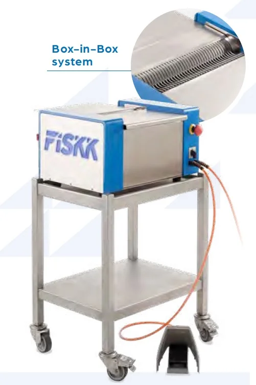 Feature: Table Top Skinning Machine Feature: Brand New Make: Fiskk Feature: Manufactured in Belgium Model: 360L Feature: 3 phase machine Feature: Requires water supply Feature: 362mm working width Feature: Suitable for various fish species Unique Box in Box system: You can easily change between blade and blunt beam so you can skin all types of fish. Feature: Superb quality and performance Feature: Full spares available Feature: Finance option available.