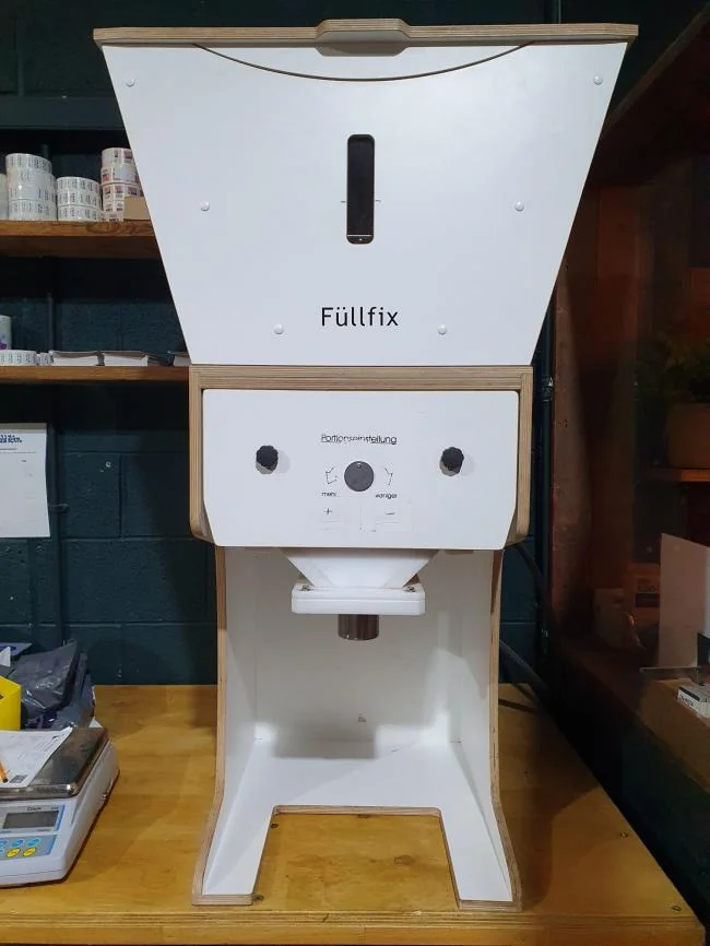 Füllfix Volumetric Coffee Dosing Unit for sale.: The Füllfix works volumetrically (on a volume basis). You therefore also need a calibrated scale to set and check the filling quantity.Simple manual machine for dosing coffee beans or other similar free flowing products.