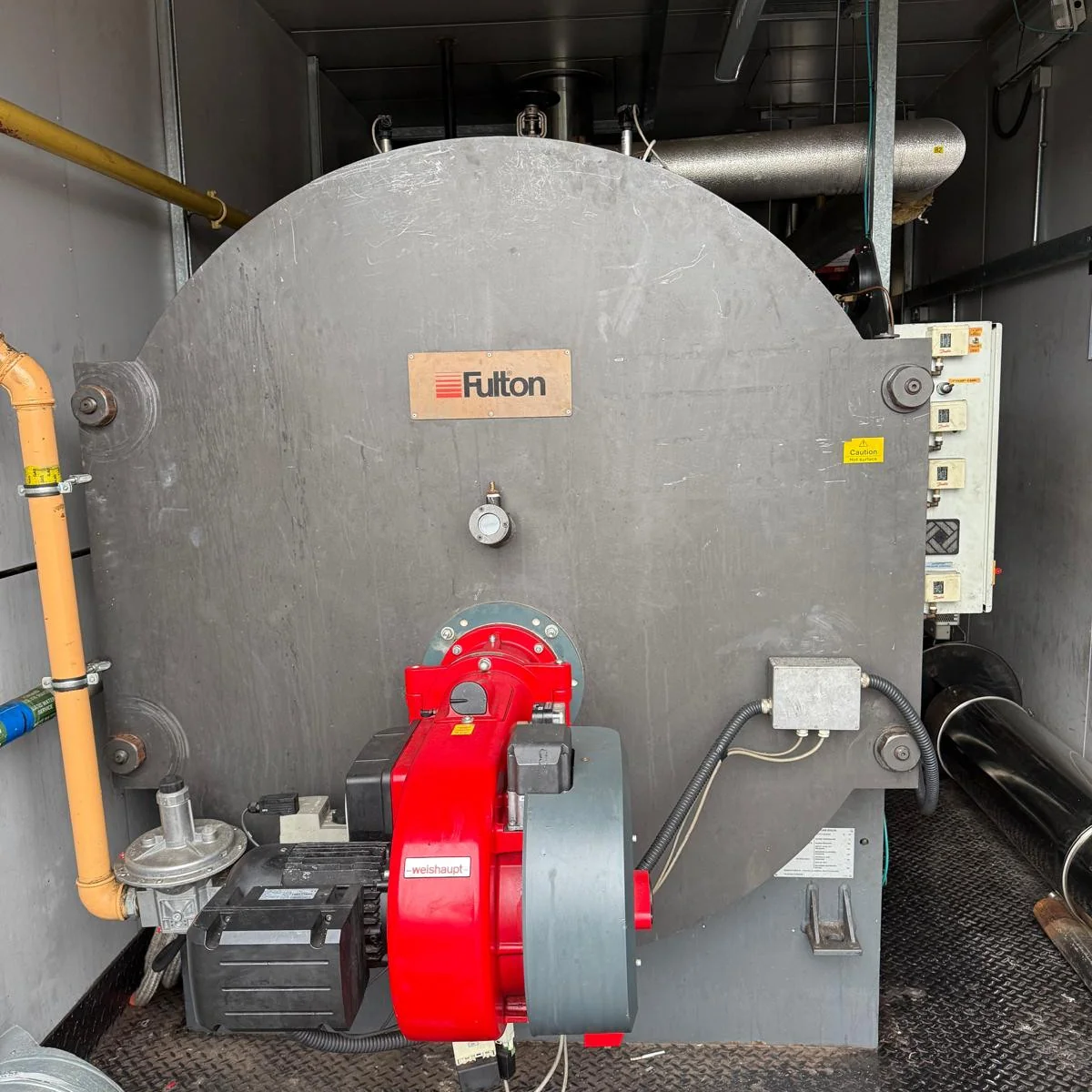 1 x Fulton Ltd horizontal steam boiler with upgraded Weishapt 750 kW gas-burner in packaged plantroom.