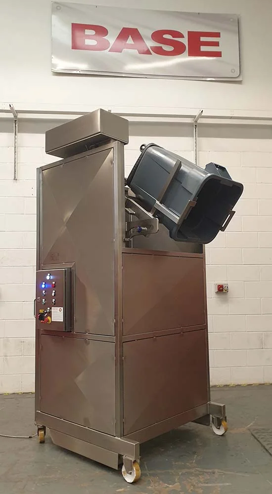 BTM/300/1600/M/G Single Pillar Guarded Brute Bin TipperThis Guarded Brute Bin Tipper is designed to lift and tip a standard 200 Litre Brute Bin at a discharge height of 1600mm. The Guarded Brute Bin Tipper is manufactured from Grade 304 stainless steel, is a welded construction throughout and is designed to be mobile on castors. The lifting is achieved by a ¾” Simplex chain driven by a motor gearbox mounted at the top of the main column. Safety Guard to BS EN 14120:2015 Safety of Machinery GuardsThis Guarded Brute Bin Tipper was supplied complete with a safety guard to meet the guidelines of BS EN 14120:2015 Safety of Machinery Guards. The safety guard is constructed from 40 x 40 x 3mm stainless steel box section and 2.0mm stainless steel sheet. It encloses the Guarded Brute Bin Tipper to a height of 2200mm on two sides, 1600mm at the tipping position with a hinged guard door through which the bins are loaded. The guard door is electrically and mechanically interlocked preventing the Guarded Brute Bin Tipper from operating when the door is open. Additionally, the guard door can only be opened when the lift carriage is at the full down position to prevent access whilst a load is raised. Guarded Brute Bin Tipper Electrical ControlThis Guarded Brute Bin Tipper is fitted with an IP65 Stainless Steel Control Panel which is mounted on the main column at a convenient position to give good maintenance access under the Provision and Use of Work Equipment Regulation 1998 (PUWER). Upper and Lower end of travel limit switches are positioned to prevent inadvertent adjustment or damage but are easily adjustable by trained personnel for fine adjustment on site. The control panel incorporates the following controls; Up, Down, Guard Release, Emergency Stop and a Reset Facility. The Guarded Brute Bin Tipper operation is on a hold to run principle so that holding the ‘Up’ push button will raise the lift to the full tip position. Once the product has been discharged, holding the ‘Down’ push button once will return the Guarded Brute Bin Tipper to the full down position. The control panel has a volt free pair of contacts which can be used to connect a ‘Call to Run’ signal if required. |