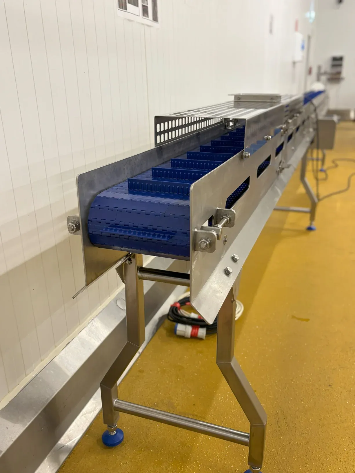 Constructed entirely from food-grade stainless steel with an Intralox modular belt (1 inch pitch, PE blue) for durability, smooth operation, and easy replacement.