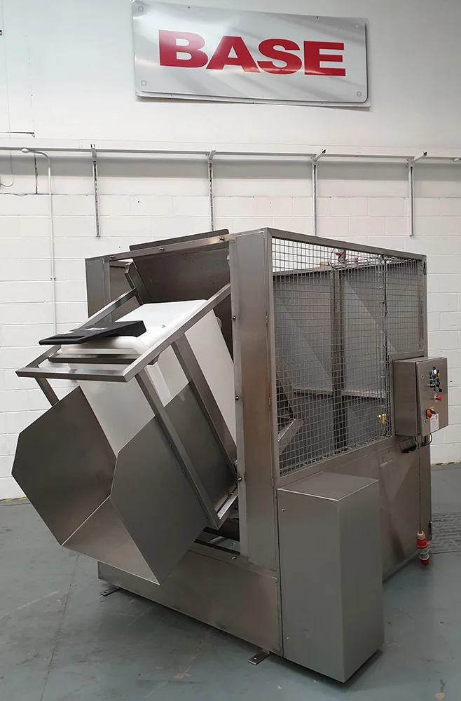 BTH/500/800/B/G Hydraulic Crate TipperThis Hydraulic Crate Tipper is designed to lift and tip a Plastic Container (1020mm Long x 735mm Wide x 740mm High) at a discharge height of 800mm. The Hydraulic Crate Tipper is a TIG welded construction throughout and was designed to be bolted to the floor at the edge of a plinth. This Hydraulic Crate Tipper was powered via a hydraulic powerpack and tipped the containers by the extension of a pair of stainless steel hydraulic cylinders to an angle of 30 degrees past the horizontal. The hydraulic cylinders are fitted with a safety check valve such that even in the unlikely event of a hydraulic hose failure, the raised bin will not fall to the floor. The lift carriage was fitted with a tipping chute that directed the cans into a skip. Safety Guard to BS EN 14120:2015 Safety of Machinery GuardsThis Tipper was supplied complete with a safety guard to meet the guidelines of BS EN 14120:2015 Safety of Machinery Guards. The safety guard is constructed from 40 x 40 x 3mm stainless steel box section and 2.0mm stainless steel sheet. The safety guard encloses the Hydraulic Crate Tipper to a height of 2200mm on two sides, 800mm on the tipping side with a pair of hinged guard doors on the fourth side. The guard doors are electrically and mechanically interlocked preventing the Hydraulic Crate Tipper from operating when the door is open. Additionally, the guard door can only be opened when the lift carriage is at the full down position to prevent access whilst a load is raised. Also included was a Remote Emergency Stop Button mounted inside the safety enclosure and the Interlock Switch had a manual release accessible from inside the safety enclosure. Hydraulic Crate Tipper Electrical ControlThis Hydraulic Crate Tipper is fitted with an IP65 Control Panel which is mounted on the main frame at a convenient position to give good maintenance access under the Provision and Use of Work Equipment Regulation 1998 (PUWER). Upper and Lower end of travel limit switches are positioned to prevent inadvertent adjustment or damage but are easily adjustable by trained personnel for fine adjustment on site. The control panel incorporates the following controls; Up, Down, Guard Release, Emergency Stop and a Reset Facility. The Hydraulic Crate Tipper operation is latched such that once the ‘Up’ push button is pressed the Hydraulic Crate Tipper will travel to the full tipped position. Once the ‘Down’ push button is pressed, it w Hydraulic Crate Tipper ill return to the full down position. The control panel has a volt free pair of contacts which can be used to connect a ‘Call to Run’ signal if required. |