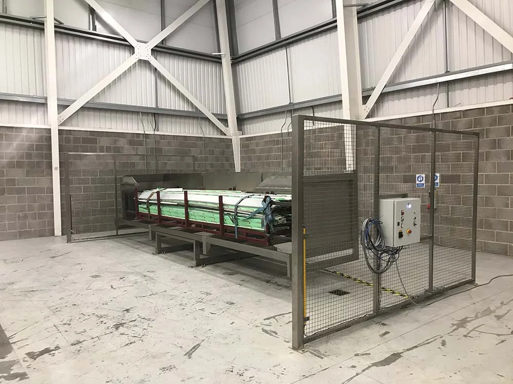 BTH/1000/1300/B/G Hydraulic Trough TipperThis Hydraulic Trough Tipper was designed to lift and tip a Trough of plastic extrusions (700 x 700 x 6100mm) with a maximum total weight of 1000 Kgs at a discharge height of 1300mm to discharge into a Shredder Trough. The Hydraulic Trough Tipper is constructed from stainless steel, is a welded construction throughout and would be bolted to the floor. This Hydraulic Trough Tipper is powered via a hydraulic powerpack and tips the Trough by the extension of a pair of hydraulic cylinders to an angle of 30 degrees past the horizontal. The hydraulic cylinders are fitted with a safety check valve such that even in the unlikely event of a hydraulic hose failure, the raised lift carriage will not fall to the floor. The Trough is loaded onto a fixed base frame using a Forklift Truck and once the Forklift Truck has reversed from the guarded area and all Safety Devices are healthy, the Hydraulic Trough Tipper tip cycle can commence. As soon as the Hydraulic Trough Tipper starts to lift, the lifting forks will raise the Trough clear of the base frame and tip it through a total angle of 120°. There was a tipping chute mounted on the lift carriage designed to retain the Trough as it is tipped and guide the extrusions into the Shredder Trough. Safety Guard to BS EN 14120:2015 Safety of Machinery GuardsThis Hydraulic Trough Tipper is supplied complete with 2 off Side Guards to be fixed to the floor at either side of the tipper. The safety guards are constructed from 40 x 40 x 3mm box section and 40 x 40mm aperture, 3mm wire weld mesh. To allow access between the Hydraulic Trough Tipper and the Shredder for maintenance there was an interlocked safety guard door in the right hand Side Guard. The guard door is electrically and mechanically interlocked preventing the Hydraulic Trough Tipper from operating when the door is open. Additionally, the guard door can only be opened when the lift carriage is at the full down position to prevent access whilst a load is raised. Hydraulic Trough Tipper Electrical ControlThis Hydraulic Trough Tipper is fitted with an IP65 Control Panel which is mounted on the guard frame at a convenient position to give good maintenance access under the Provision and Use of Work Equipment Regulation 1998 (PUWER). Upper and Lower end of travel limit switches are positioned to prevent inadvertent adjustment or damage but are easily adjustable by trained personnel for fine adjustment on site. The control panel incorporates the following controls; Up, Down, Guard Release, Emergency Stop and a Reset Facility. The Hydraulic Trough Tipper operation is based on a ‘hold to run’ principle such that either the ‘Up’ or ‘Down’ pushbuttons must be held for the machine to operate, as soon as a button is released, the machine stops. The control panel has a volt free pair of contacts which can be used to connect a ‘Call to Run’ signal if required. |