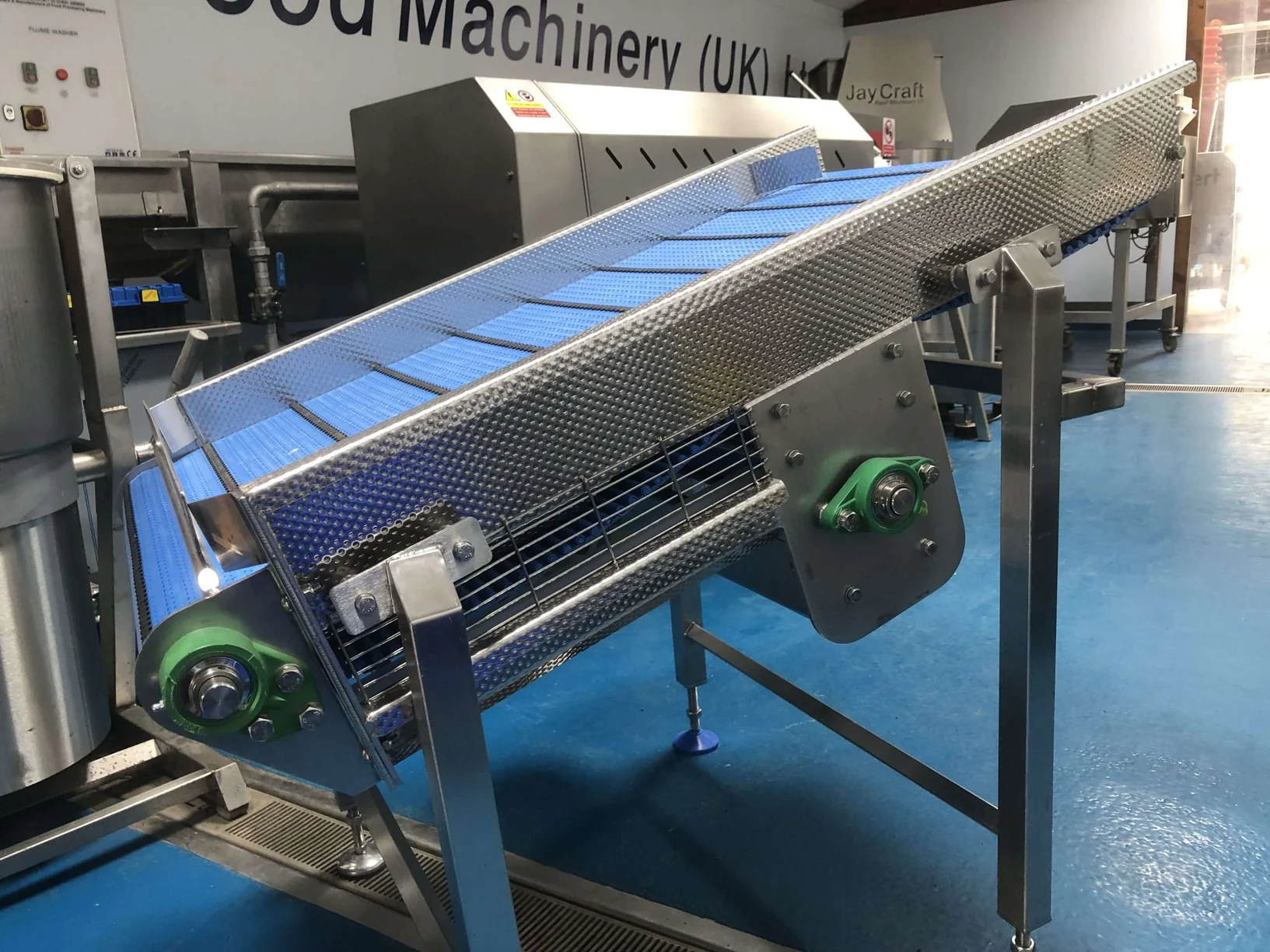 This used Incline Conveyor has been fabricated in stainless steel. It has a blue intralox food grade belt
