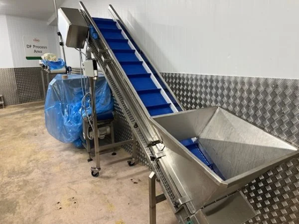 Feature: Incline Conveyor Feature: 330mm wide belt Hopper: 65cm x 65cm Feature: 1m hopper height Discharge height: 1.75m Total height: 2.2m Feature: Stainless frame Feature: Mounted on wheels for easy movement Feature: Very Good condition