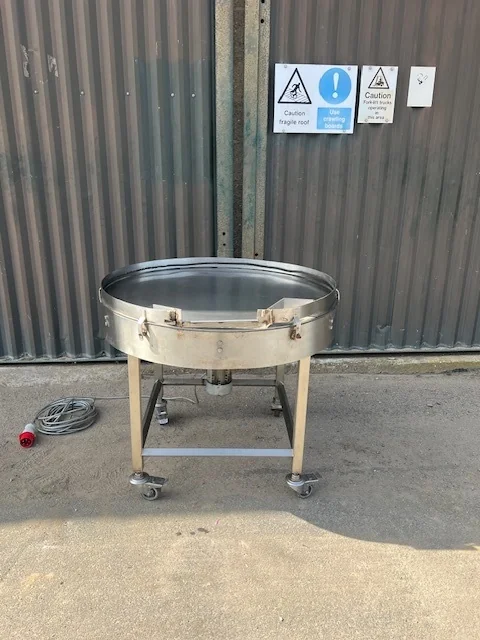 Feature: Lazy Sue Rotating Table Feature: 1m diam table Feature: Stainless steel frame Feature: Stainless steel top Feature: Adjustable feet Make: Arnott Conveyor Feature: 2015 Feature: Very Good Condition