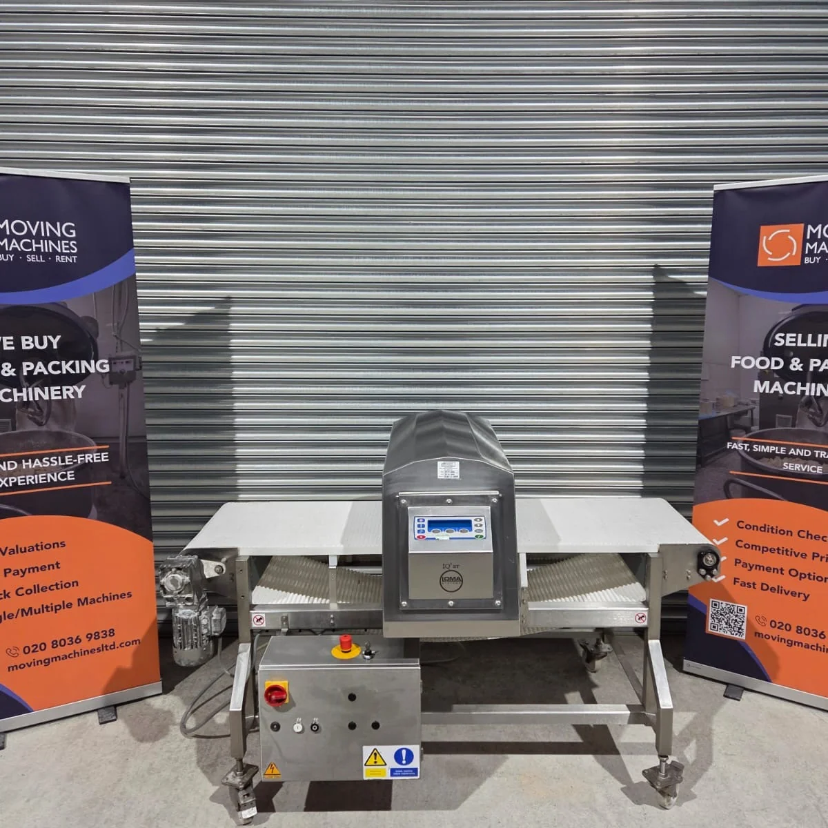 Loma Systems metal detector with alarm and stop-on-detect reject system, fitted onto a mobile stainless steel frame.