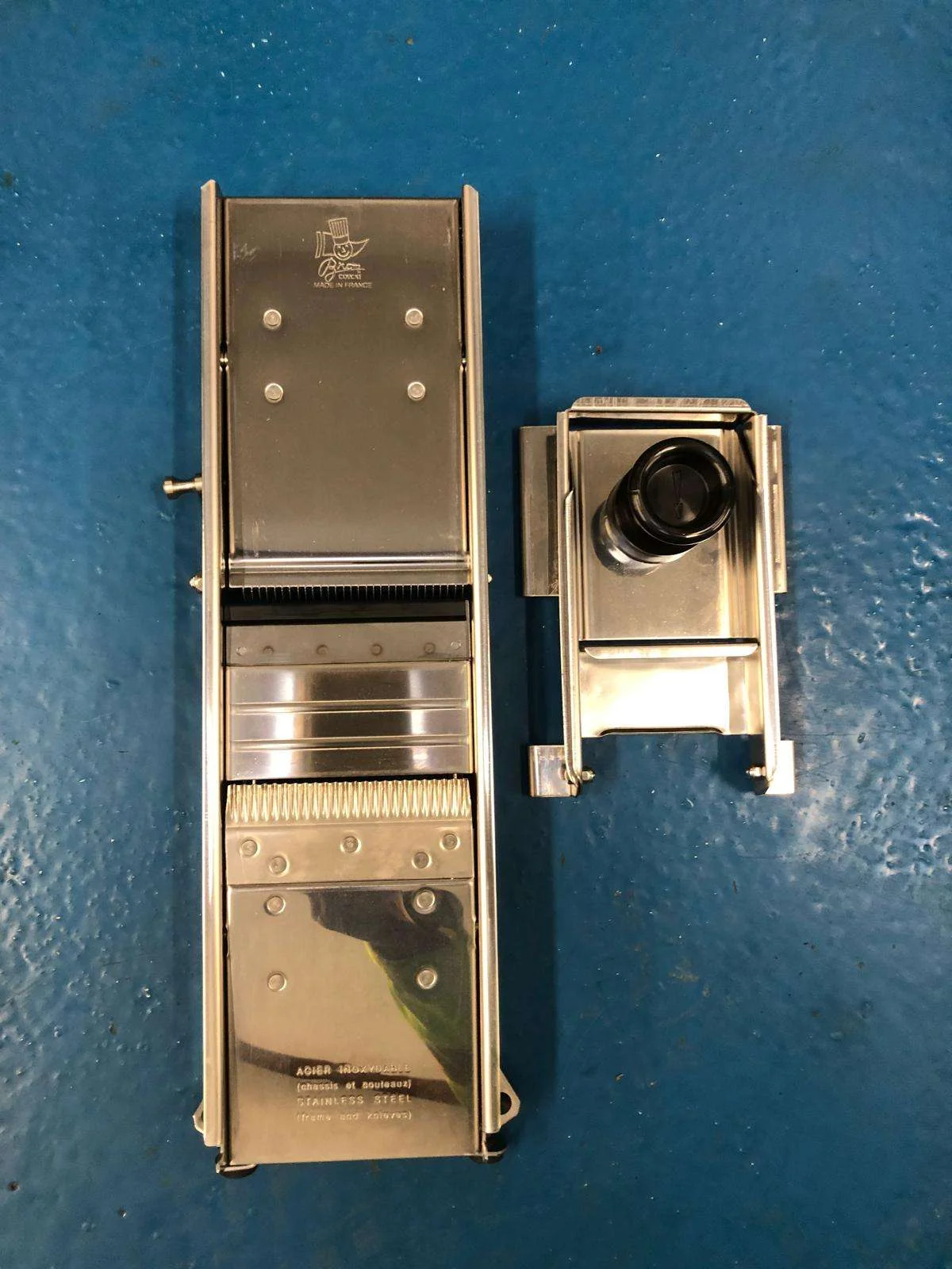 New Louis Tellier Professional Mandoline for sale. The Bron Coucke professional Mandoline is constructed from stainless steel. Made in France and has the following dimensions: 25x12x7cm