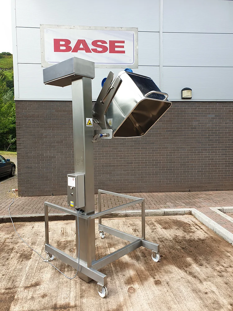 BTM/300/1850/M Single Pillar Mobile Bin HoistThis Single Pillar Mobile Bin Hoist is designed to lift and tip a 200 Litre tote bin at a discharge height of 1850mm. The Mobile Bin Hoist is manufactured from Grade 304 stainless steel, is a welded construction throughout and is designed to be mobile on castors on a horizontal base frame. The lifting is achieved by a ¾” Simplex chain driven by a motor gearbox mounted at the top of the main column. The unguarded Mobile Bin Hoist is fitted with our unique safety latch which engages automatically in the extremely unlikely event of a lift chain failure. Mobile Bin Hoist Electrical ControlThis Mobile Bin Hoist is fitted with an IP65 Stainless Steel Control Panel mounted on the main column at a convenient position to give good maintenance access under the Provision and Use of Work Equipment Regulation 1998 (PUWER). Upper and Lower end of travel limit switches are positioned to prevent inadvertent adjustment or damage but are easily adjustable by trained personnel for fine adjustment on site. The unguarded Mobile Bin Hoist operates on a ‘hold to run’ principle such that the ‘Up’ or ‘Down’ pushbuttons must be held for the Mobile Bin Hoist to operate. As soon as either button is released, the Mobile Bin Hoist will stop. The control panel has a volt free pair of contacts which can be used to connect a ‘Call to Run’ signal if required. |