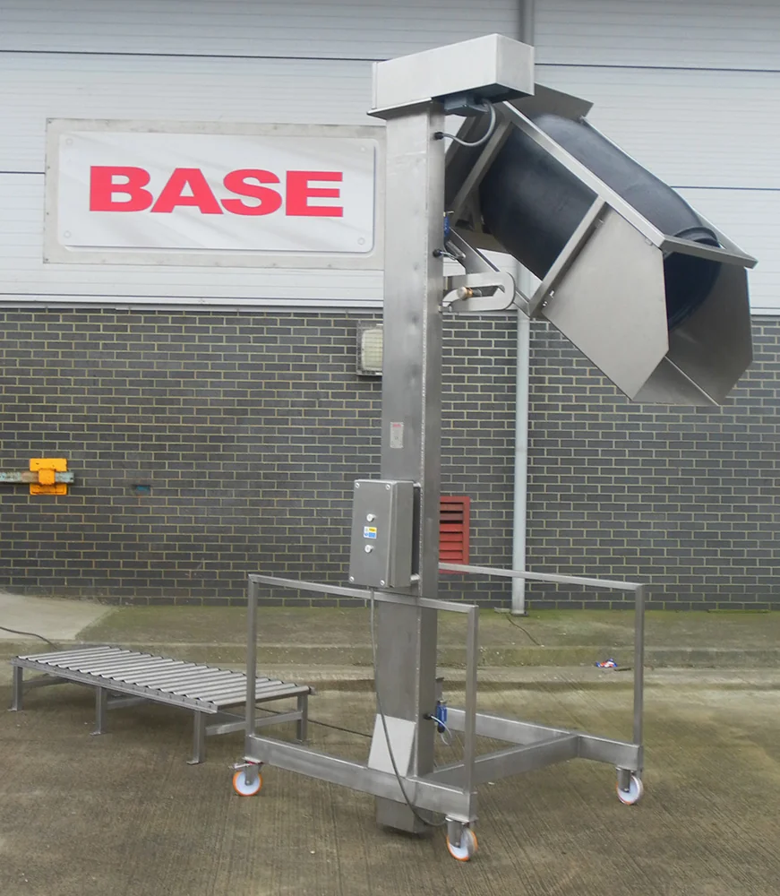 BTM/250/1200/M Single Pillar Mobile Drum TipperThis Single Pillar Mobile Drum Tipper is designed to lift and tip a Blue Mauser at a discharge height of 1200mm. The Mobile Drum Tipper is constructed from Grade 304 stainless steel and is fully TIG welded throughout. The lifting is achieved by a ¾” Simplex chain driven by a motor gearbox mounted at the top of the main column. The Mobile Drum Tipper is fitted with our unique safety latch which engages automatically in the extremely unlikely event of a lift chain failure. Infeed Gravity Roller TrackThe Mobile Drum Tipper was supplied with gravity rollers in the base of the lift carriage and with a 1500mm long x 600mm wide gravity roller conveyor which would be positioned at the loading point of the tipper. The Mauser was slid off the pallet onto the roller conveyor and then rolled into the lift carriage to be tipped. Mobile Drum Tipper Electrical ControlThis Mobile Drum Tipper is fitted with an IP65 Stainless Steel Control Panel which is mounted on the main column at a convenient position to give good maintenance access under the Provision and Use of Work Equipment Regulation 1998 (PUWER). The Mobile Drum Tipper has ‘dead man’s handle’ control such that the ‘Up’ or ‘Down’ pushbuttons must be held for the Mobile Drum Tipper to operate. As soon as the button is released, the Mobile Drum Tipper will stop. The control panel has the facility for a ‘Call to Run’ signal to be connected if required. |