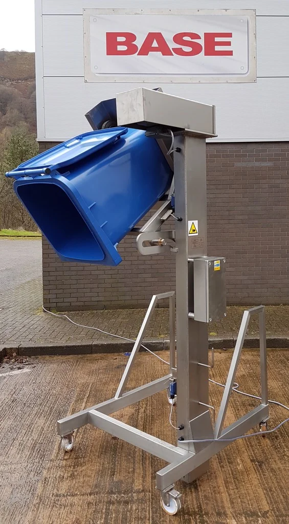 BTM/250/1500/M Single Pillar Mobile Wheelie Bin TipperThis Single Pillar 240 Litre mobile wheelie bin tipper is designed to lift and tip at a discharge height of 1500mm. The Mobile Wheelie Bin Tipper is manufactured from Grade 304 stainless steel and is a welded construction throughout. The lifting is achieved by a ¾” Simplex chain driven by a motor gearbox mounted at the top of the main column. The Mobile Wheelie Bin Tipper is fitted with our unique safety latch which engages automatically in the extremely unlikely event of a lift chain failure. Mobile Wheelie Bin Tipper Electrical ControlThis Mobile Wheelie Bin Tipper is fitted with an IP65 Stainless Steel Control Panel which is mounted on the main column at a convenient position to give good maintenance access under the Provision and Use of Work Equipment Regulation 1998 (PUWER). The Mobile Wheelie Bin Tipper has ‘dead man’s handle’ control such that the ‘Up’ or ‘Down’ pushbuttons must be held for the Mobile Wheelie Bin Tipper to operate. As soon as the button is released, the Mobile Wheelie Bin Tipper will stop. The control panel has the facility for a ‘Call to Run’ signal to be connected if required. |