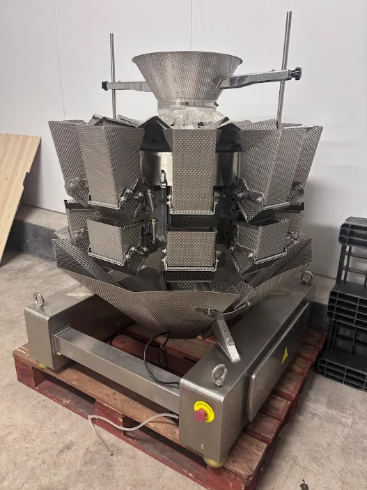 A 10 head multi head weigher suitable for packing puffed food, candy, small biscuits, sliced vegetables, nuts, crisps, popcorn, pet food, and small hardware.