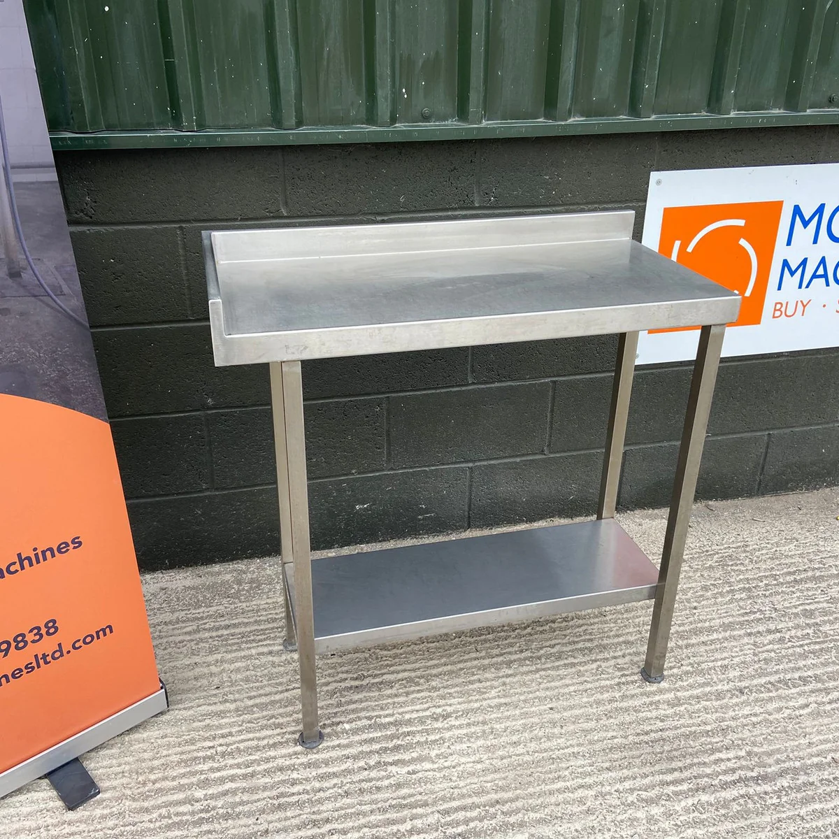 Flat worktop stainless steel table with splash guard, solid lower undershelf for additional storage and square tube legs with adjustable feet.