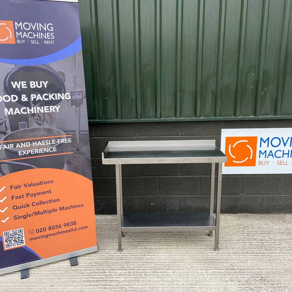 A narrow stainless steel prep table in good condition with rear and left-side splash guard, solid lower shelving and adjustable feet.