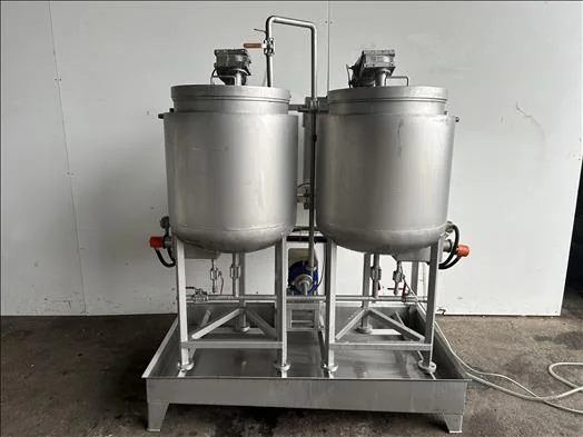 NNP cooking kettles, Stainless, cooking and mixing system on skid, two 350L mixing tanks, with Alfa Laval GM1 centrifugal pump and Randolph 600 series peristaltic pump, jacketed tanks, adjustable temperature and variable speed pumps, 3Ph