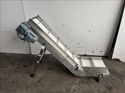NNP Flighted elevator conveyor, Stainless, elevates from 200mm to 1000mm, belt width 340mm, with side guides, 3Ph