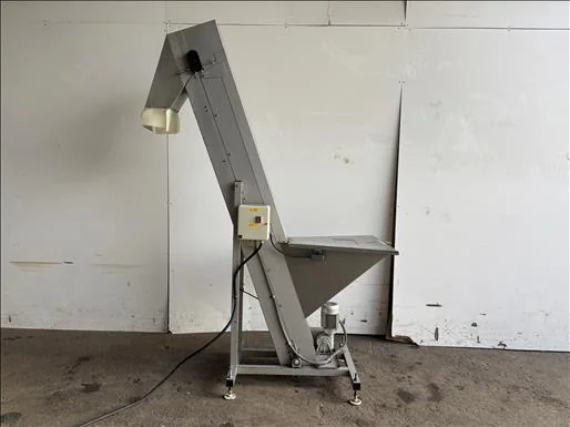 NNP flighted elevator conveyor, elevates from 300mm and discharges at 1900mm, 100Kg hopper, belt width 200mm, overall length 1750mm, 3Ph